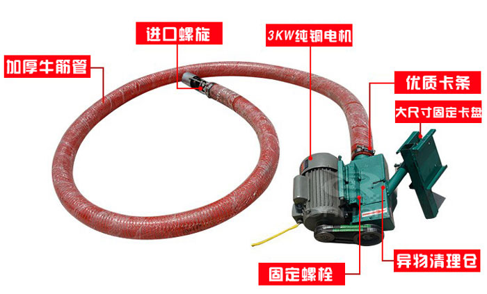 吸糧機是有螺旋管、螺旋葉片、機頭、機位、電機五部分組成。